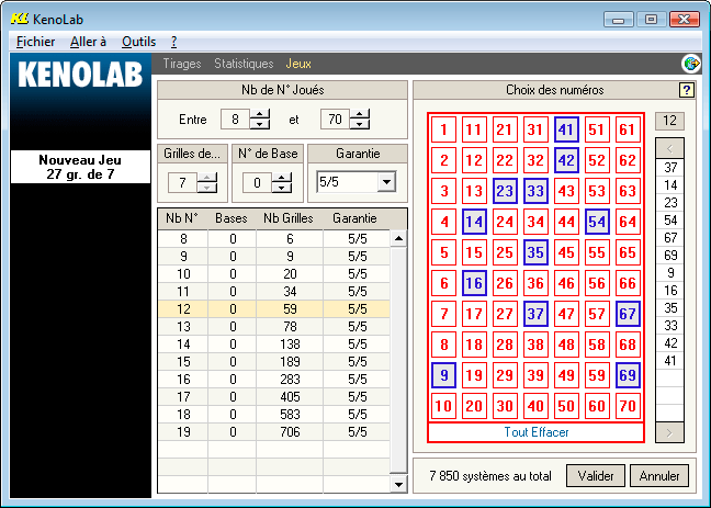 - Une base de données astronomique de 7.850 systèmes réducteurs pour faire ses jeux, avec ou sans base, couvrant les grilles de 2 à 10 numéros du Keno