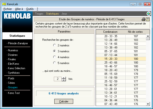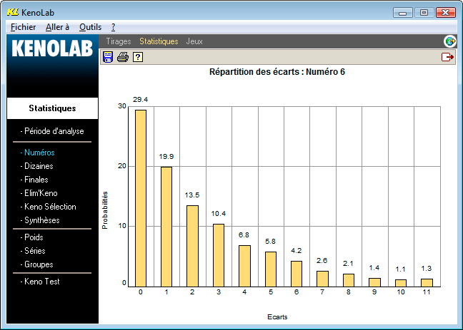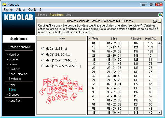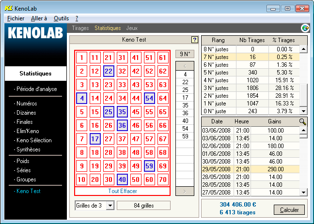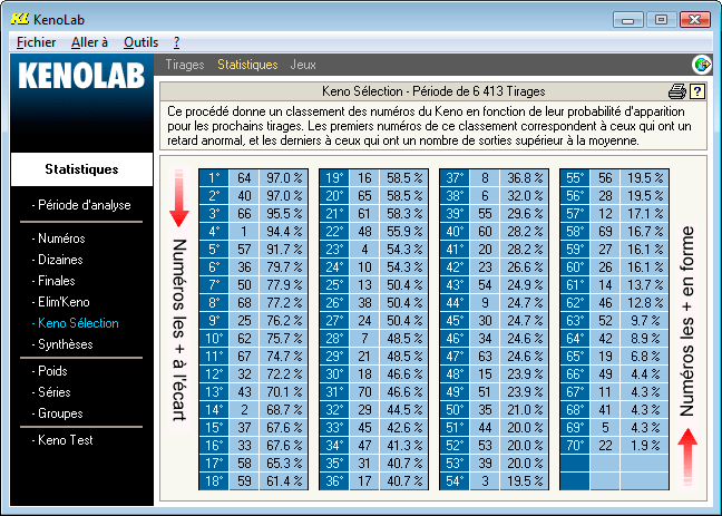 - De nombreuses statistiques automatiques et avancées, comme la statiscopie des Numéros, Keno Sélection, ou encore les numéros chauds ou froids, tests des Dizaines, Finales, répartition des écarts, affinités, annoncés, annonciateurs ; test des poids des grilles, des séries de numéros, des groupes de numéros qui sortent le plus souvent ensemble...
